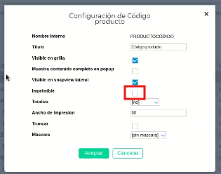Configuración de columnas para la descarga: Para asegurar que los datos (como el Código de Producto) aparezcan en el PDF o Excel descargado, seguí estos pasos: