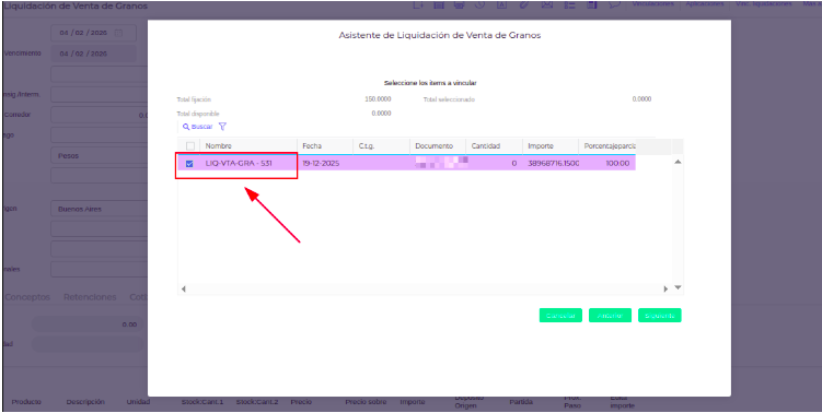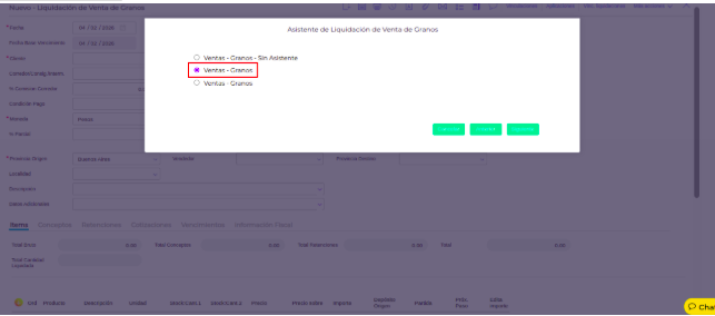 - Activar Asistente: Hacer clic en el botón central: “Ventas - Granos” (asistente de vinculación).