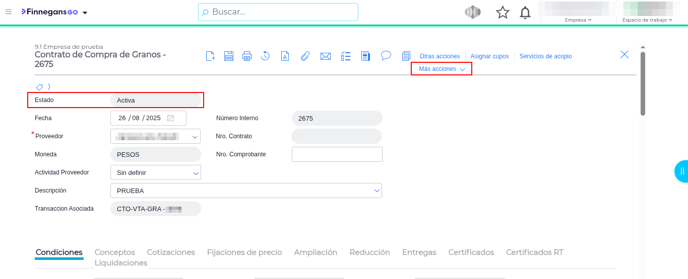 ¿Es posible finalizar un contrato de granos y que su estado se muestre como ‘finalizado’ en el sistema?