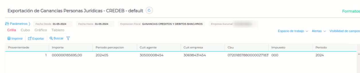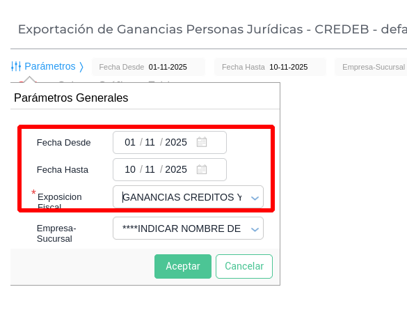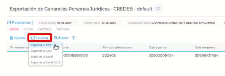 Ruta: Menú - Gestión Empresarial - Impuestos - Exportación de Ganancias Persona Jurídica CREDEB