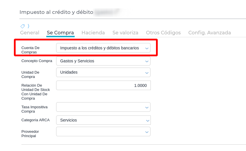 Es necesario tener creado un producto “Impuesto al crédito y débito”, el cual tiene que tener asignada la cuenta "“Impuestos a los Créditos y Débitos Bancarios” en la solapa “Se Compra”.
