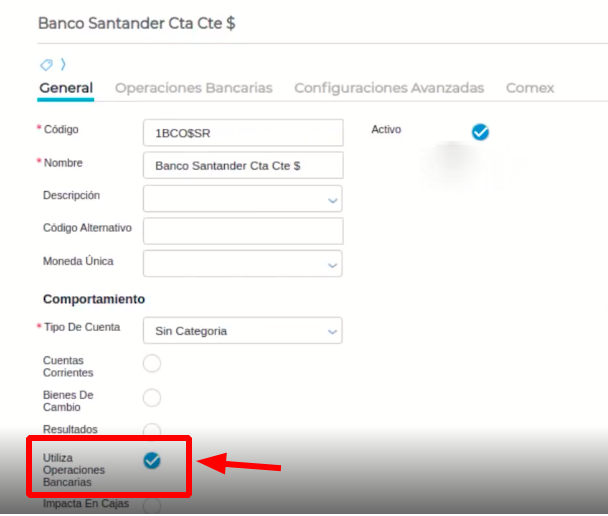 Ingresar a la cuenta del Banco. Verificar que tenga el check de “Utiliza Operaciones Bancarias”.
