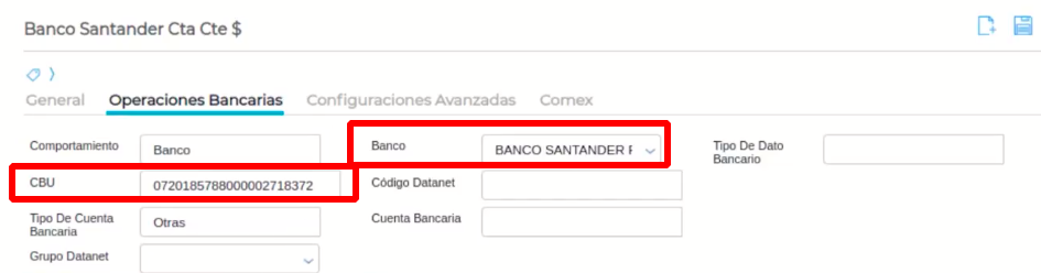 - En la solapa Operaciones Bancarias, verificar que tengamos configurado el campo de Banco y el CBU para que el archivo TXT generado proporcione esta información.