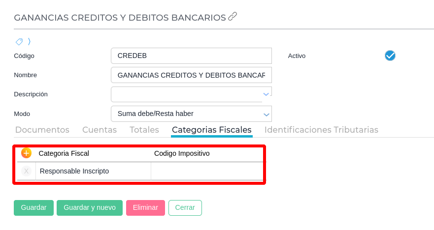- En la solapa Categorías Fiscales, es necesario agregar la categoría fiscal correspondiente.