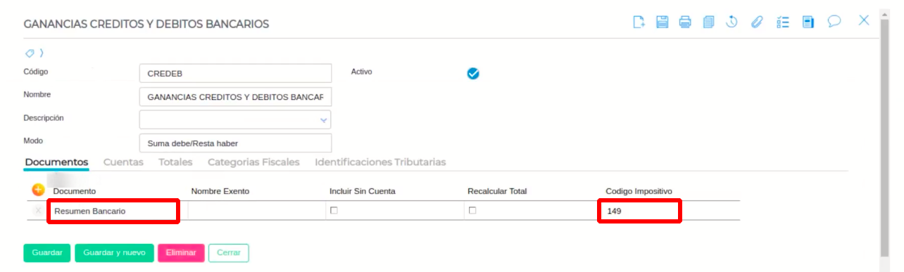 En la solapa de Documento se agrega el documento Resumen bancario y se le asigna el código impositivo.