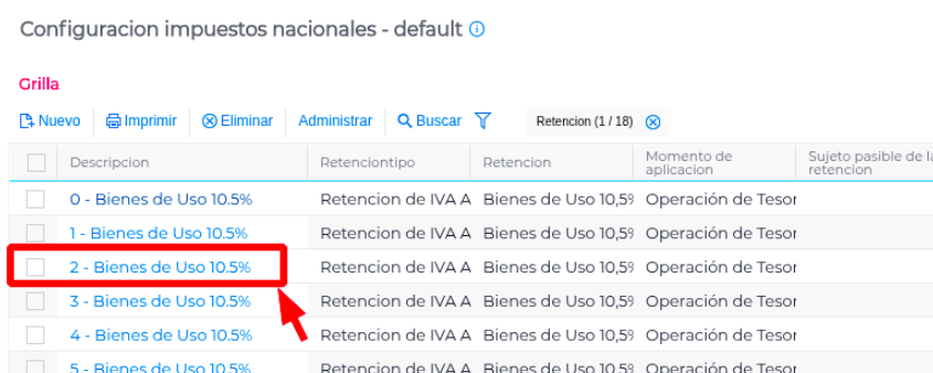 Se accede desde el Menú → Gestión Empresarial → Impuestos → Maestros → Tipos de Retención - Seleccionar