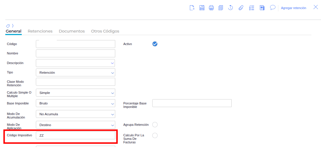 Dentro del tipo de retención, verificar que el campo Código Impositivo sea numérico.