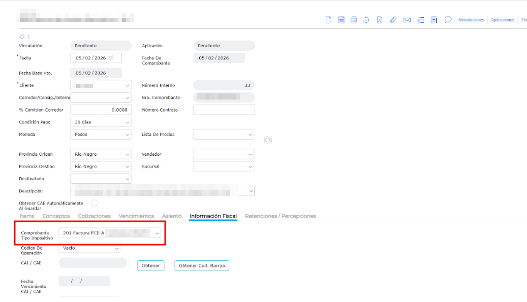 Dentro del tipo de documento que no obtiene CAE, dirigirse a la solapa Información Fiscal, allí obtener el nombre del Tipo de comprobante impositivo.
