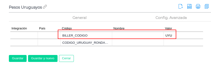 En el maestro de monedas se debe completar el código adicional BILLER_CODIGO según corresponda con la siguiente tabla: Tablas Uruguay