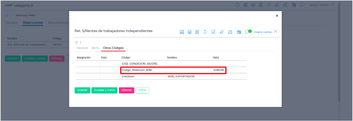 En el maestro de retenciones debe indicarse el valor del código adicional Codigo_Retencion_Biller correspondientes según la tabla.