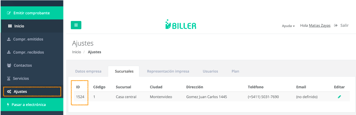 aquí deberás poner el ID CÓDIGO de la sucursal que figura en Biller.