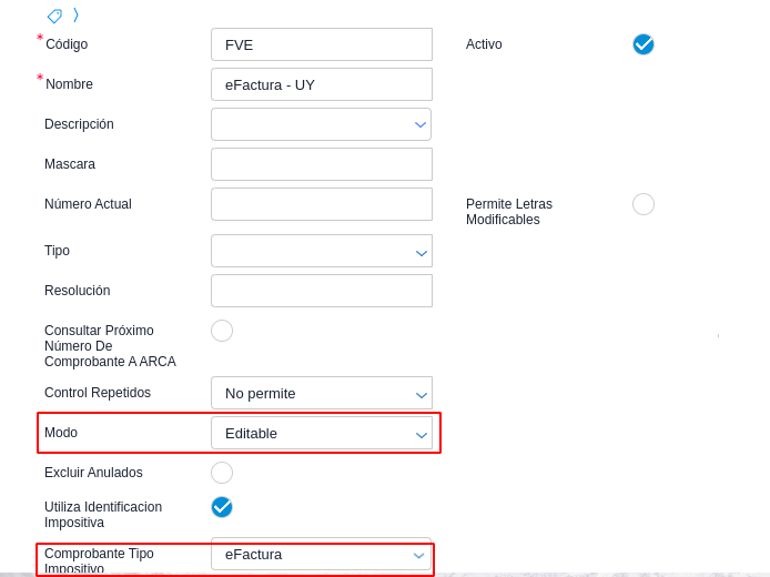 Debe asociarse este comprobante a los talonarios correspondientes. Por defecto configurar en Modo editable, ya que Biller asigna el número de comprobante.