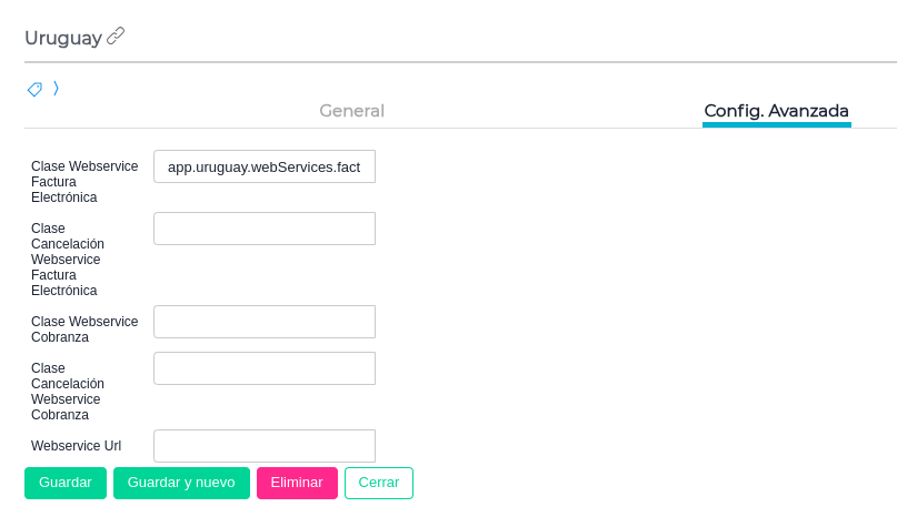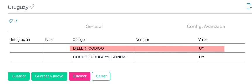 Al país que pertenece el clientes a quienes se emite el documento, la clave webservices no se debe agregar, solo se debe configurar el código adicional BILLER_CODIGO con las siglas que indica la siguiente tabla: Tablas Uruguay