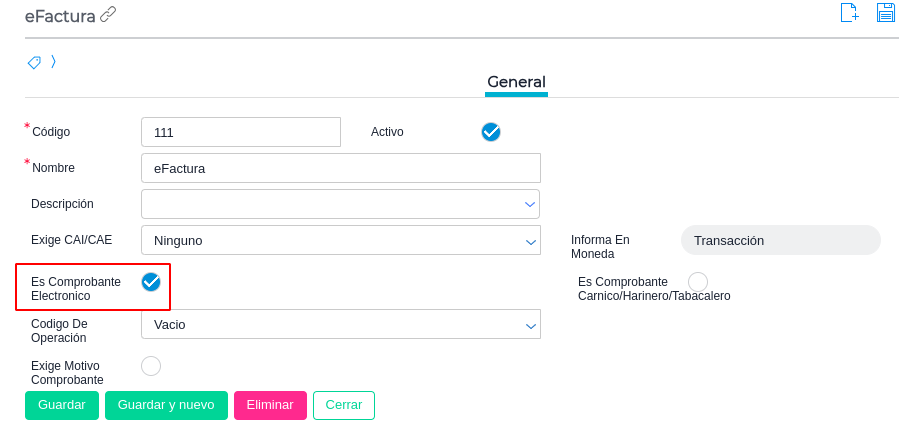 Para poder utilizar el servicio de obtención de CAE el tipo de comprobante impositivo asociado al talonario de la transacción debe ser electrónico, para lo que deberás tildar el Checkbox de “Es comprobante electrónico”.