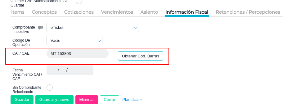 Una vez guardada la transacción presionar el botón “obtener” en la solapa “información fiscal”. Esto devolverá el número de CAE.