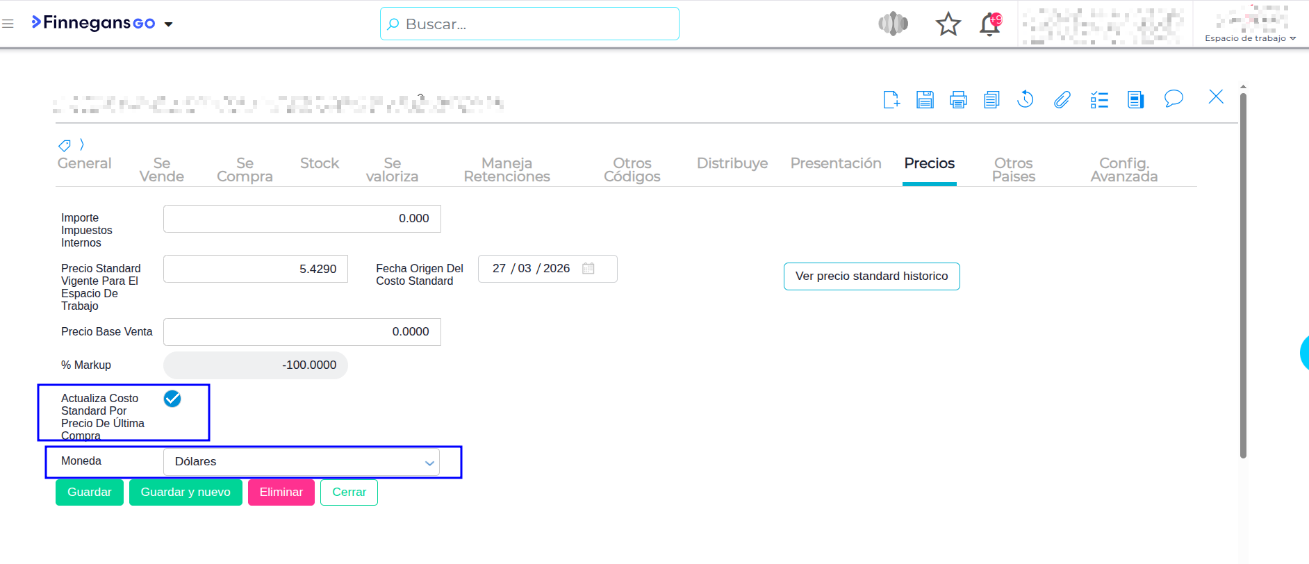 - Verifica que esté marcado el check: “Actualiza Costo Standard por precio de última compra”. Si este tilde está desactivado, el sistema no actualizará el valor automáticamente tras la factura.