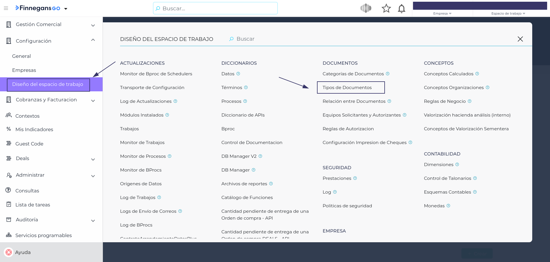 Menú → Configuración → Diseño de espacio de trabajo → Tipos de documentos