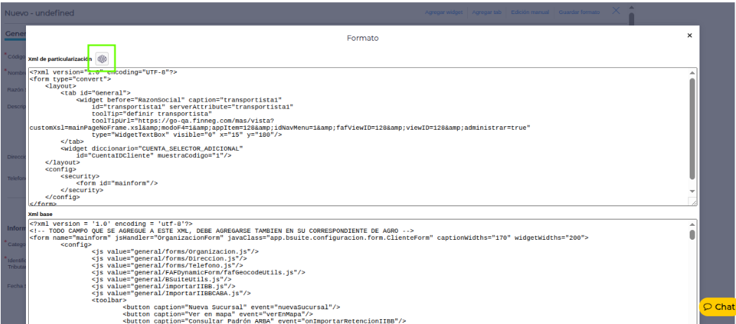 - Haga clic en el botón de Finni XML posicionado junto al área de código.