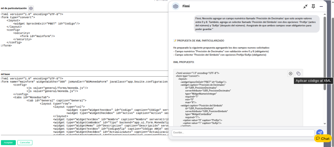 Funcionamiento: En el bloque de código entregado por el asistente, aparecerá un icono de acción rápida denominado “Aplicar código al XML”. Al seleccionarlo, el sistema transfiere el código generado directamente al editor de particularización sin necesidad de copiar y pegar manualmente.