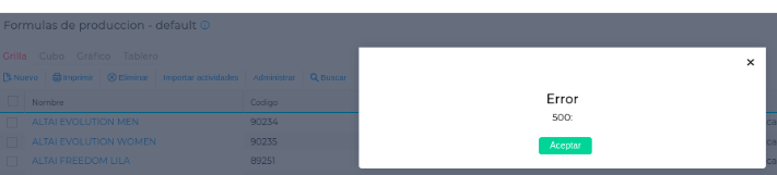 Al ingresar al Maestro de Fórmulas de Producción y seleccionar una fórmula existente —por ejemplo: “ALTAI LOV/STO”—, el sistema muestra el mensaje de error “Error 505”. Esto impide continuar con la operación.