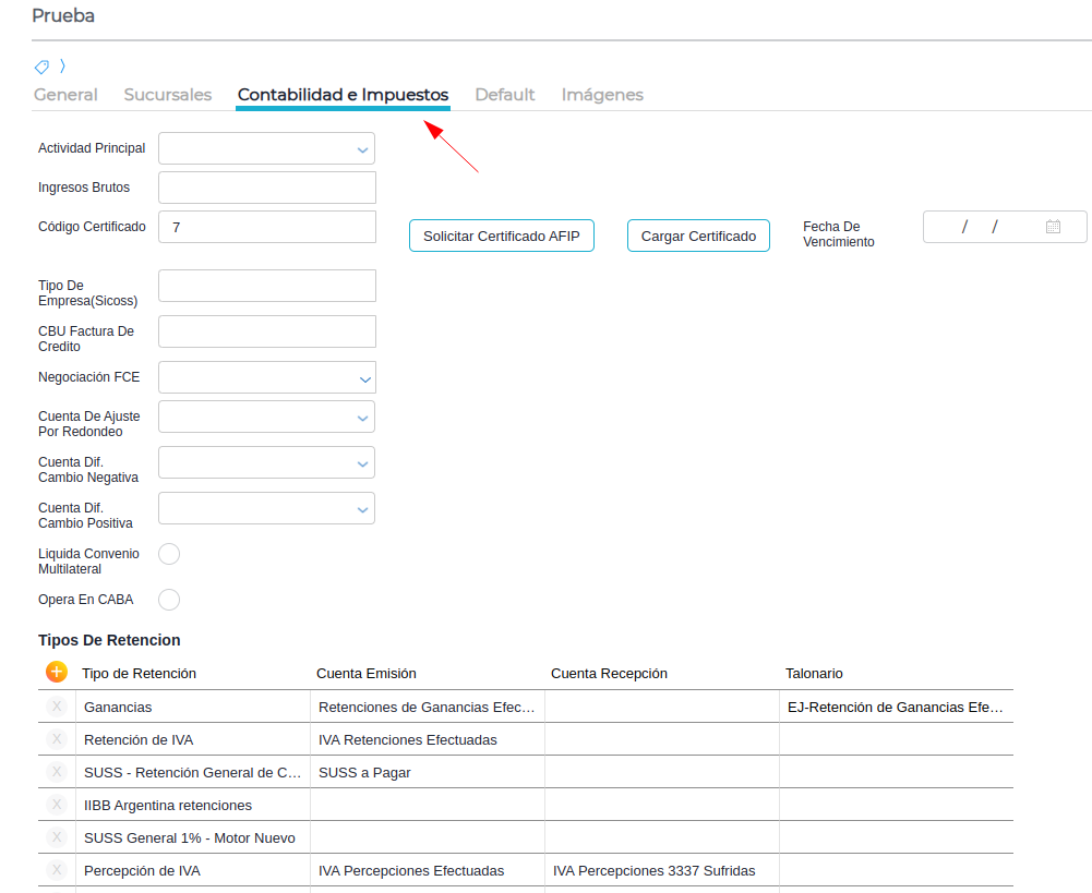 Ingresar a la solapa “Contabilidad e impuestos” y luego dirigirse a “Tipos de retención”.