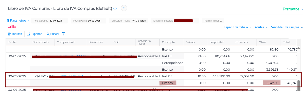 Una vez que guardamos los cambios, actualizamos el Libro de IVA Compras y revisamos, ahora debería visualizarse el gasto exento:
