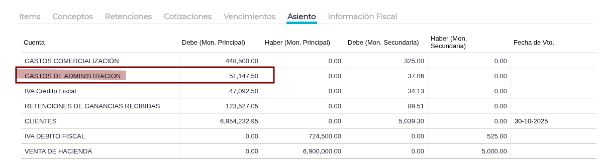 - dicho producto, tiene configurada la siguiente cuenta (lo podemos ver en la solapa Asiento de la liquidación):