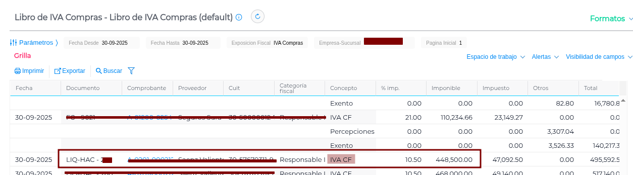 Pero al revisar el Libro de IVA Compras, asi es como se ven los gastos de la liquidación, solo se ve el gasto gravado: