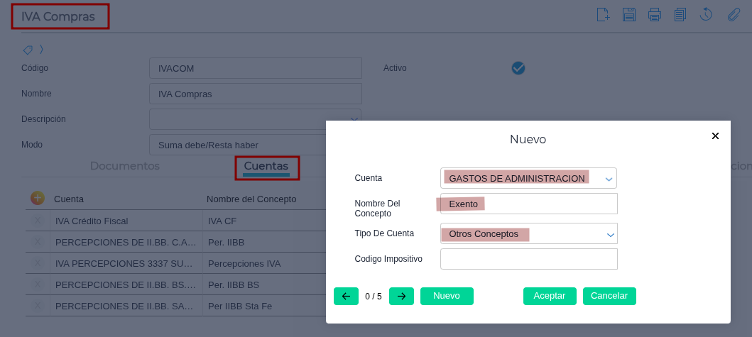 Respuesta: La respuesta está en la Exposición Fiscal que utilicemos para el Libro de IVA Compras. En dicha exposición, en la solapa Cuentas, debemos agregar la cuenta que tenga configurada el producto en cuestión, en el Nombre del Concepto, debe completarse con la palabra Exento y en Tipo de Cuenta, Otros conceptos:
