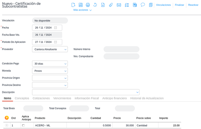 El objetivo es que el usuario pueda certificar avances de contratos de subcontratistas sin necesidad de realizar cálculos manuales, manteniendo siempre la coherencia entre cantidades, porcentajes e importes.