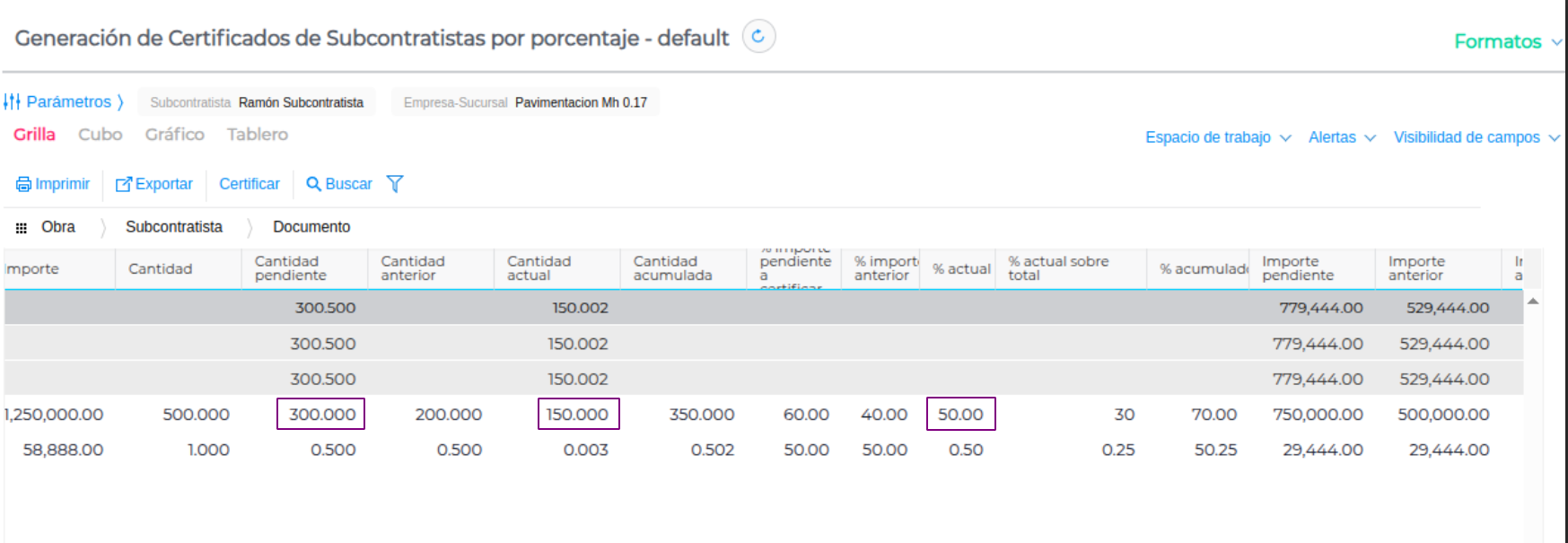 Ambos valores representan el avance actual sobre el total pendiente de certificar del contrato, y siempre se mantienen sincronizados.