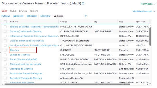 Buscar la viewer del objeto que queremos visualizar. Por ejemplo, Clientes.