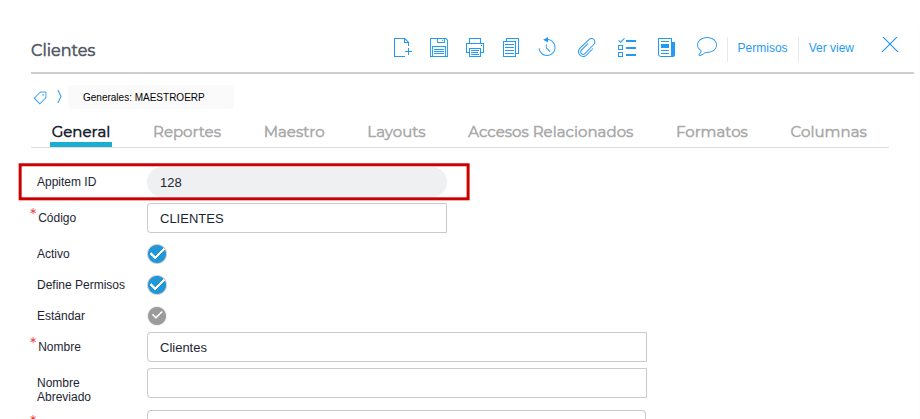 Appitem IDobtenemos el parámetro{ID de la viewer}. En este caso, para la view de clientes, el valor es 128. -