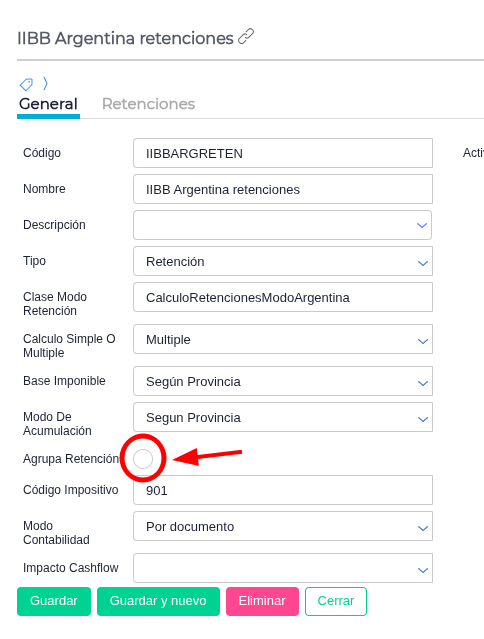 - Definir la agrupación mediante el check “Agrupa retención”: