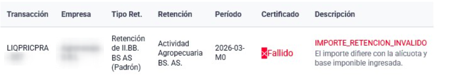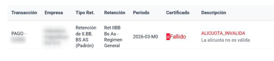Al intentar generar certificados desde el Análisis de Retenciones, Finnegans puede devolver notificaciones de rechazo emitidas por ARBA. A continuación, los motivos y sus soluciones: