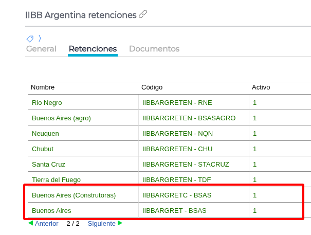 Tipos de Retención: Crear conceptos específicos dentro de IIBB Argentina Retenciones (Ej. “Buenos Aires General” con Código ARBA 6 y “Buenos Aires Constructora” con Código ARBA 1).