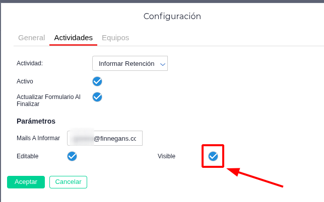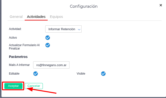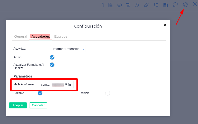 - Configuración de Notificaciones: En los parámetros de los BProcs “Generar” y “Anular”, ingresar al campo “Mails a informar” en la solapa Actividades y detallar los correos electrónicos que recibirán los avisos de éxito o error. Si es más de uno, separarlos con punto y coma (;).