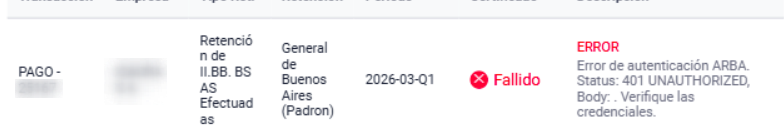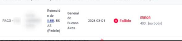 - Resolución: Ingresar a la web de ARBA, ir a “Trámites y consultas” → “Consultas de Agentes de Recaudación Suspendidos” y buscar la CUIT de la empresa. Si figura como “No Inscripto” o “Suspendido”, se debe contactar al asesor contable para regularizar la situación. Si figura como “Activo”, el problema radica en credenciales incorrectas. Para más información ingresar al siguiente link. Error 403 (no body)