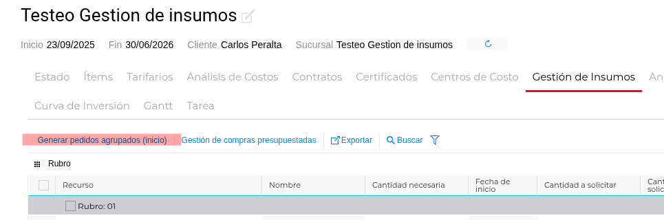 - Ingresar a Gestión de Obra → Gestión de Insumos para ver los insumos agrupados.