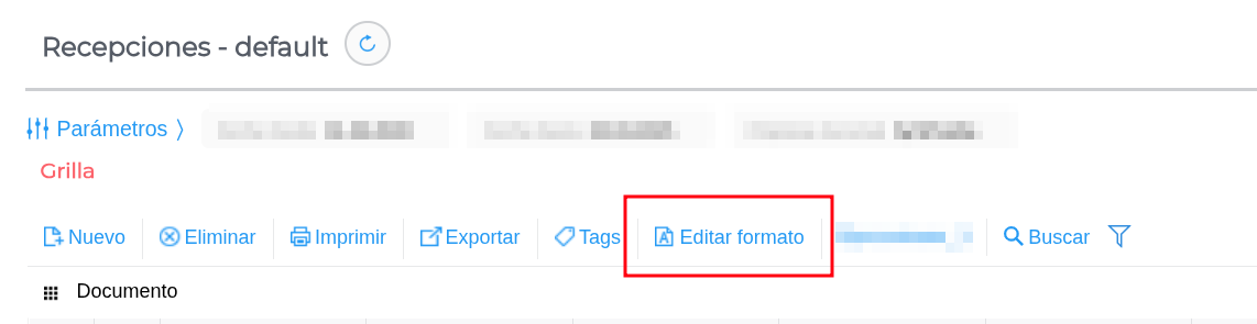 - Botón “Editar formato”: Aparecerá en la parte superior de la grilla, siempre que el documento tenga una personalización activa.