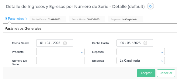 - Número de serie: si se ingresa un valor en este campo, sólo se muestran en la grilla los movimientos de entrada y salida de ese número de serie en particular.