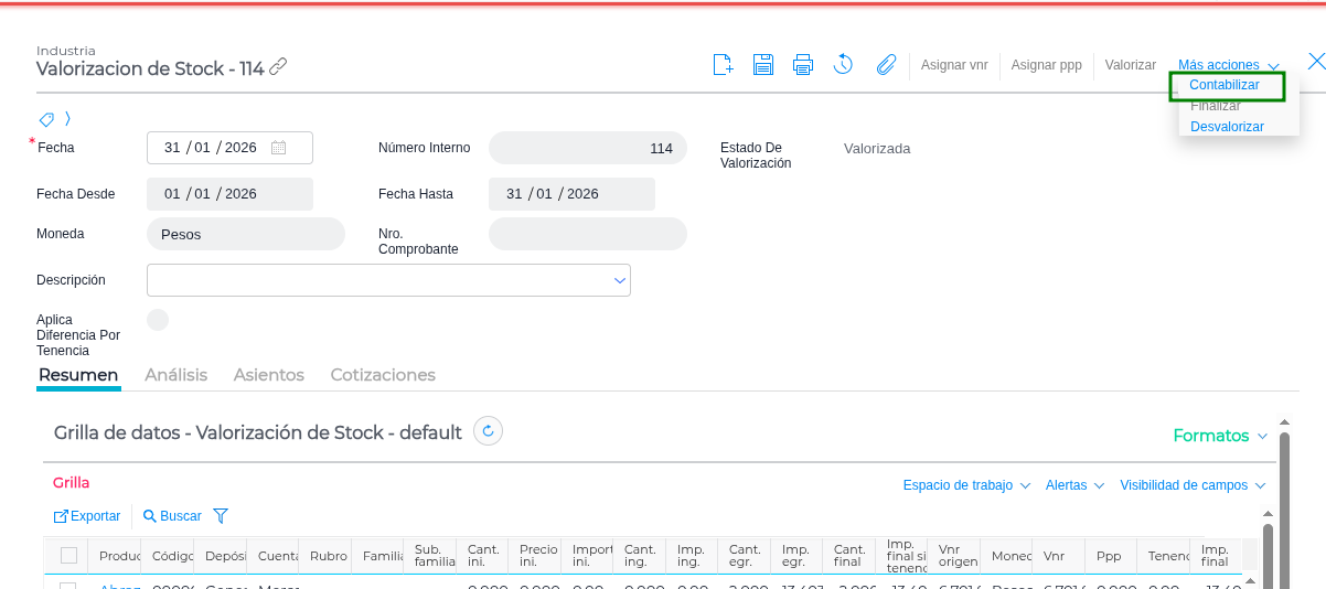 Haz clic en Contabilizar. El sistema contabilizará lo valorizado.