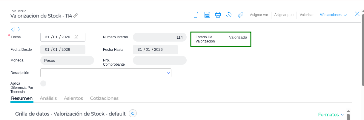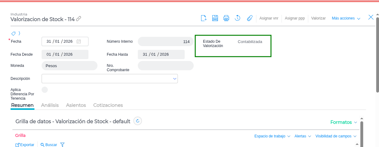 - Una vez corregido los errores, presiona “Valorizar” nuevamente. La Valorización quedará en estado “Valorizada”