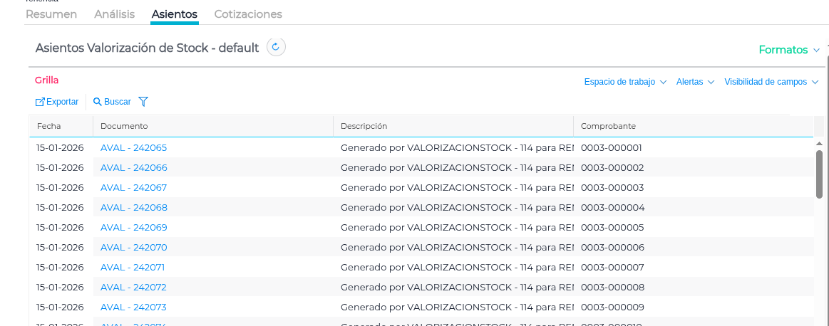 - Si el control es exitoso, se generan los asientos automáticos de ajuste de stock y costo.