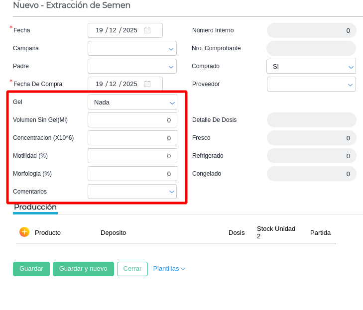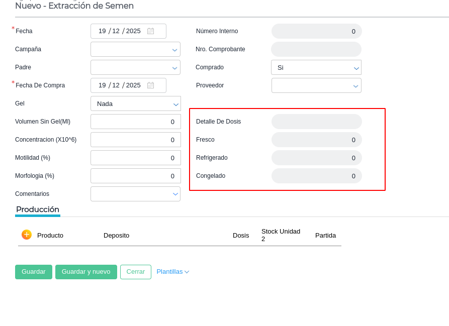 Al guardar el documento de ‘’obtención de semen” automáticamente se genera la recepción del producto, según sea por compra o por extracción.