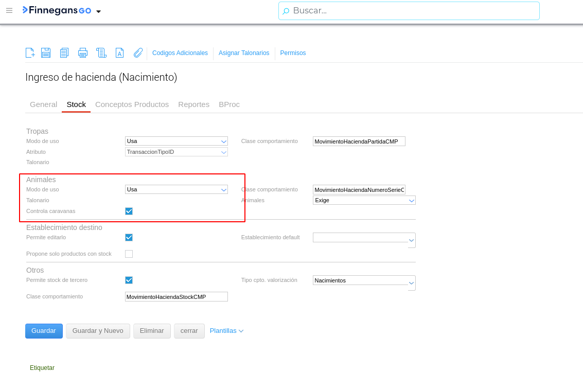IMPORTANTE: Tener en cuenta que para dar de alta un animal desde el informe de caravanas y luego cargar su alta a través de alguno de los documentos que dan de alta hacienda (recepciones, nacimientos, ajustes, etc) se requiere tener configurado el documento, en el apartado de stock –> animales como “USA”: