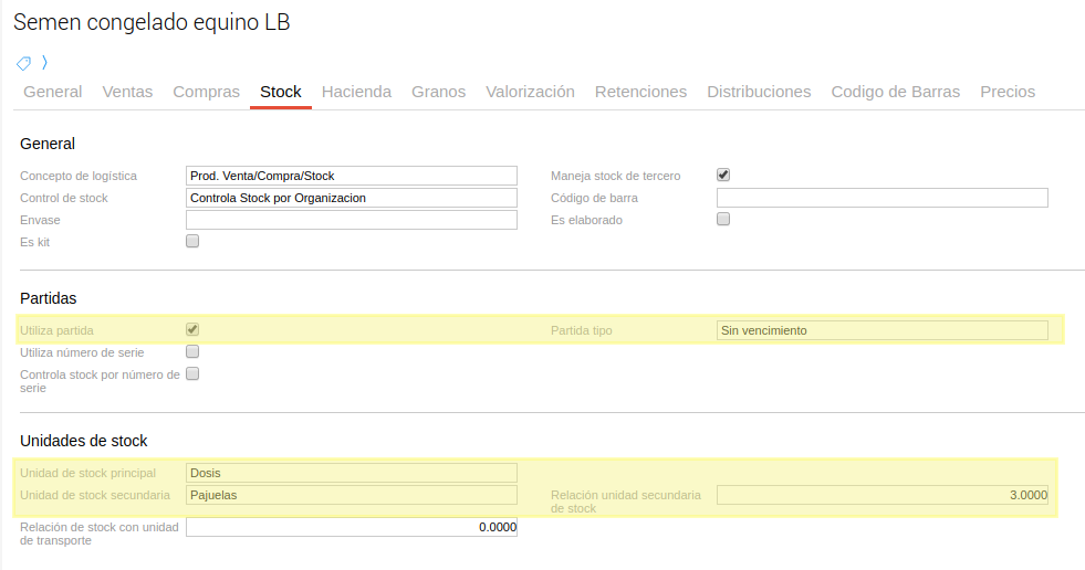 Para el control de stock de este tipo de productos se recomienda asignar la unidad principal “Dosis” y la secundaria a conveniencia (pajuela, unidades, mililitros, etc). En caso de usar unidad secundaria, definir su relación con la unidad principal.