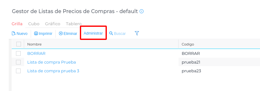 Gestión empresarial → Compras → Maestros → Gestor de Listas de Precios de Compra