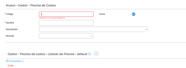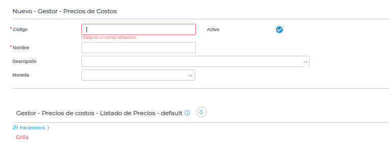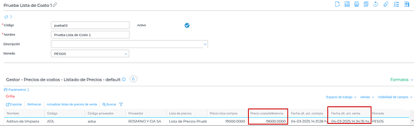 Una vez completados los datos y guardando, se procederá a crear automáticamente la lista de precios de costo: