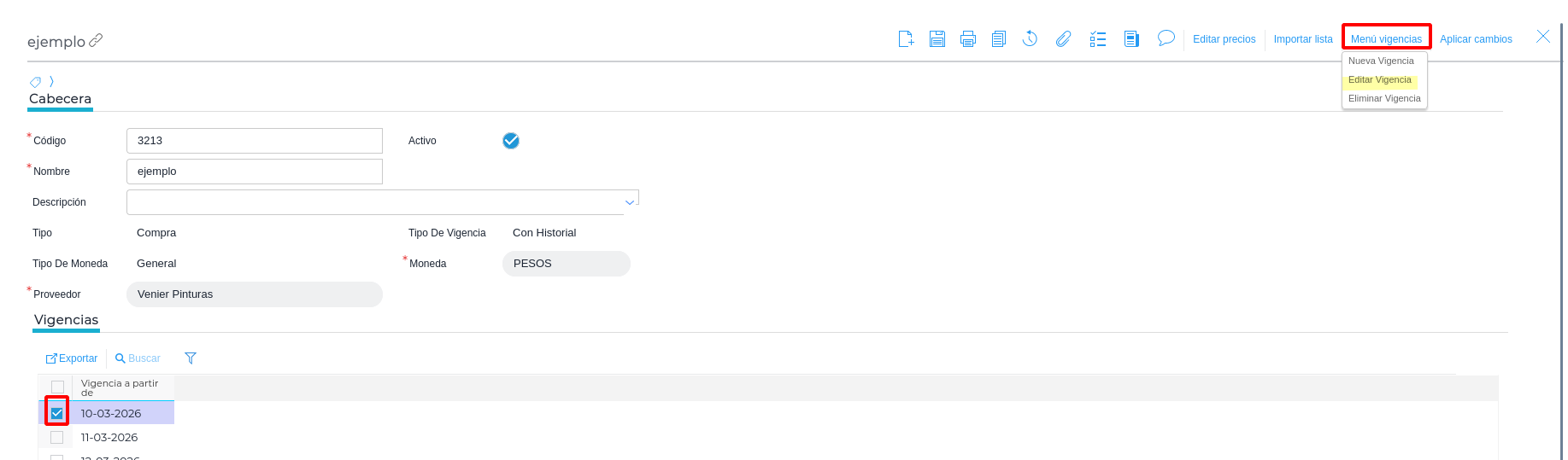 - Con historial: permite crear múltiples fechas de vigencias de precios en una sóla lista de precios.
